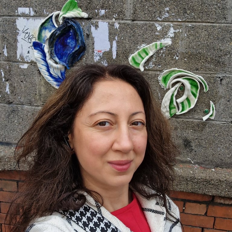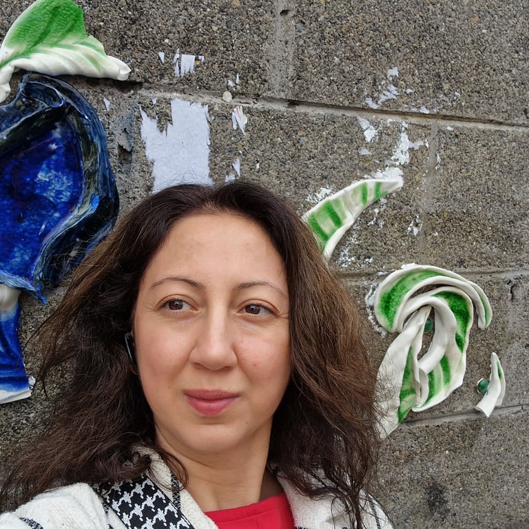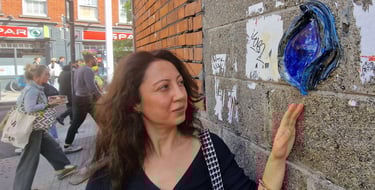 I create handmade ceramic panels using natural clay and recycled glass. Each piece is made with care and placed quietly on public walls — no frame, no spotlight.